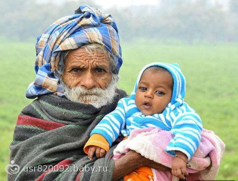 94-летний индиец Рамжит Рахав (Ramjit Raghav) претендует на звание самого старого отца в мире. У него и его 54-летней жены Шакунталы Деви (Shakuntala Devi) маленький Викарамжит – первый и пока единственный ребенок. Он был зачат и рожден естественным путем, потому его появление родители считают чудом и подарком богов. Сам отец-молодец утверждает, что ему значительно больше 100 лет, но у него хватит сил и здоровья поставить сына на ноги. Сохранять отличную форму и мужское здоровье господину Рахаву помогает интересная диета, состоящая из ежедневного употребления 3-х литров молока, половины килограмма миндаля и такого же количества очищенного топленого масла. Напомним, что предыдущий рекорд принадлежал тоже индийцу, 90-летнему Нану Рам Йоги (Nanu Ram Jogi), который в 2007 году стал отцом в 21-й раз.