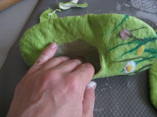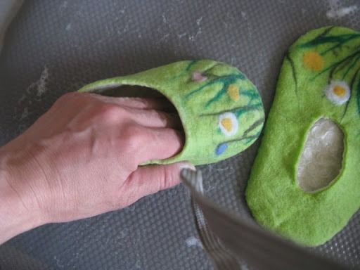 Разглаживая швы, придаем нашему тапочку форму. Как следует массируем его изнутри.