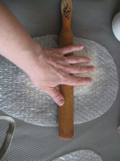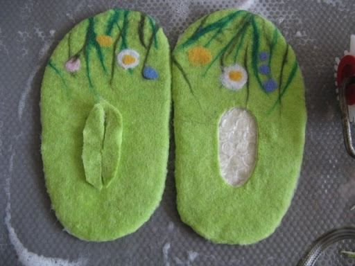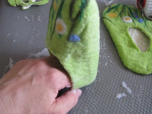 Когда тапок у нас уже почти готов, можно устроить ему легкий шок посредством контрастных водных процедур и шмяканья об дно ванны, это уплотнит наш тапок. Но можно этого и не делать (как уверяют специалисты), а увалять тапульки руками, пользуясь только пупырчатой пленкой в качестве стиральной доски.
