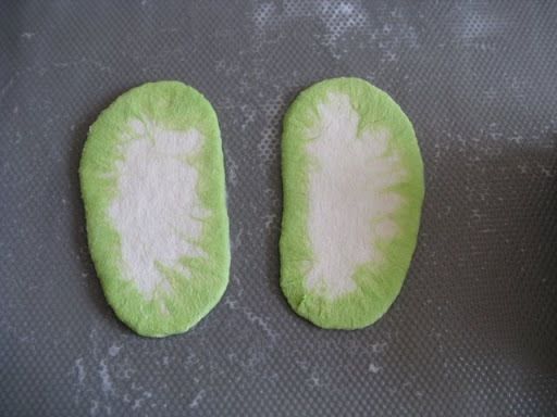 Теперь выкладываем внешние слои наших тапулечек, у меня это ярко-зеленый. Кладем шерсть перпендикулярно предыдущему слою (а предыдущий был вдоль), т.е. поперек шаблона. Дальше выложим пятый — вдоль, и шестой — опять поперек.