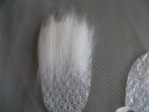 Начинаем укладывать шерсть на шаблон: отрываем от ленты тонкие прядки и выкладываем сверху на шаблон, оставляя припуски 1,5-2 см