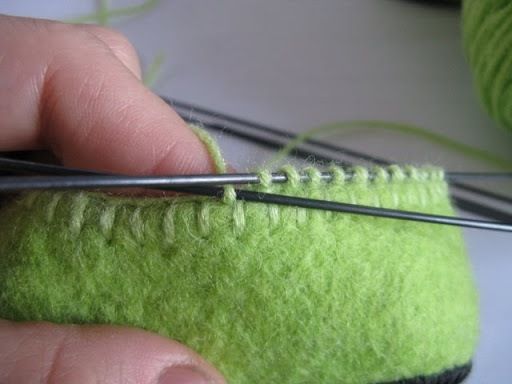 Теперь надвязываем резинку (самая, пожалуй, нудная часть ). Прикидываем, сколько петель нам нужно на резинку, в моем случае их нужно 44, т.к. я вяжу из достаточно тонкой пряжи на тонких (d=1,8 мм) спицах. Обшиваем край пинетки обметочным швом, таким образом, чтобы в итоге получилось нужное количество петель.
