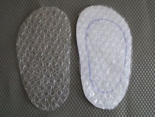 Вырезаем шаблоны (у меня из пупырки, но можно из клеенки, подложки для ламината, толстого полиэтилена и т.п.), лучше сразу два, чтобы валять тапки параллельно, так они получатся более одинаковыми.