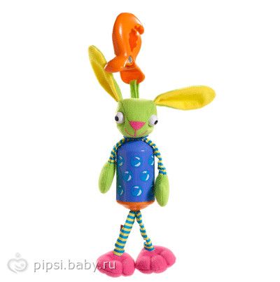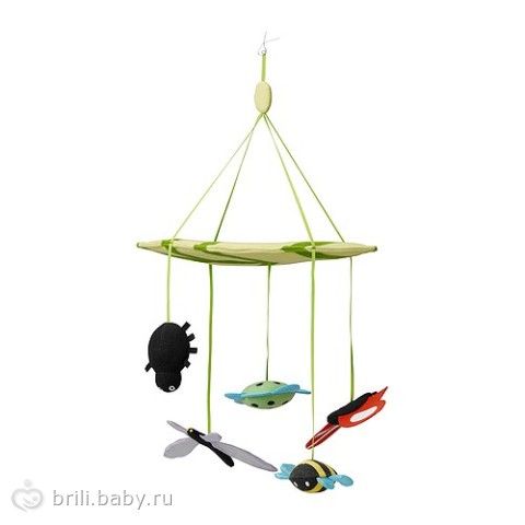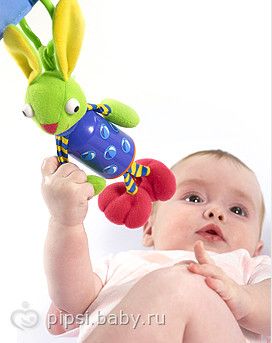 я его вешаю на борт кроватки на уровне ручек и Тимоха к нему тянется, хватает за лапы и в роооот тащит))) он еще и звенит, у него туловище с бубенцами)