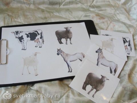Уже полторы недели с САшей изучаем козу, корову, овцу и лошадь. Сегодня решила закрепить пройденное, сделала накануне лото. Карточки на всякий случай заламинировала скотчем (и правильно сделала!). САша не совсем идею, конечно, поняла, но поиграть поиграла.