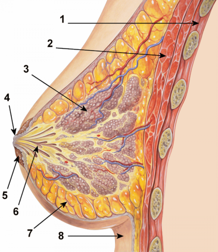 Строение молочной железы: 1 — грудная стенка; 2 — грудные мышцы; 3 — молочная доля; 4 — грудной сосок; 5 — ареола; 6 — молочный проток; 7 — жировая ткань; 8 — кожа