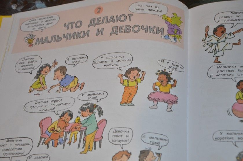Начинается книга с того, чем похожи девочки и мальчики.Да-да, именно похожи.Что и девочки и мальчики могут любить играть в машинки, и те и те любят прыгать и т.п.