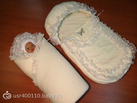 • Конверт на двух молниях с капюшоном. Состав: велюр, бязь, синтепон, кружево, аппликация