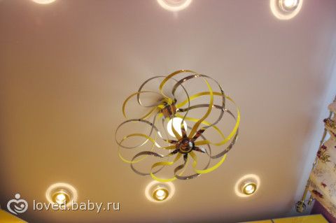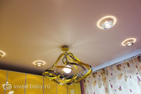 Потолок мы решили сделать натяжной, матовый. Делал родственник, у которого это свой бизнес, соответственно результатам мы более чем довольны! Моим условием было отличное освящение, поэтому света на моей кухне много. Она у меня светлая)))) Помимо большой люстры, 6ти встроенных ламп есть еще и подсветка под кухонными шкафами!