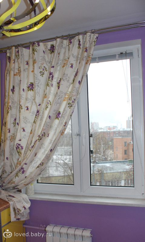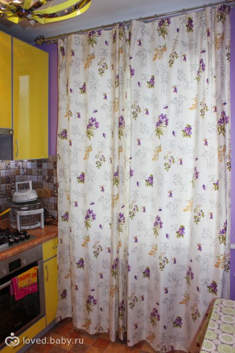 Штора. Она была куплена в виде ткани. Я долго не могла увидеть то, что мне понравится, а когда увидела эту ткань, сразу решила что из нее сошью полотно шторы на кухню Я изначально хотела полотно в пол, довольно плотное. Света мне на кухне хватает, а когда хочется дневного света, я открываю штору.