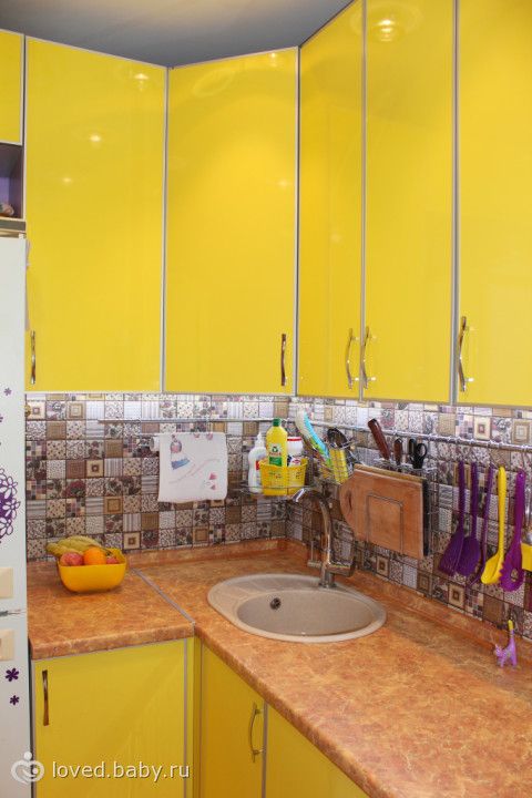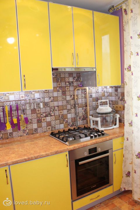 Цвет кухни яркий, как мы и хотели. Мы изначально решили что в кухне будут присутствовать желтый и лиловый тона, от этого и исходили! Получилась солнечная кухонька) Техника вся встроенная: варочная панель, духовой шкаф, стиральная машина. Вытяжка над плитой встроенная в шкаф. В углу видно мой аэрогриль! Раньше у меня не было духовки на нашей старой кухне и все вкусняшки творились в нем! Можно сказать я асс в кулинарии в аэрогриле. Даже сейчас, когда есть духовка с кучей функций, аэрогриль у меня в активном пользовании!