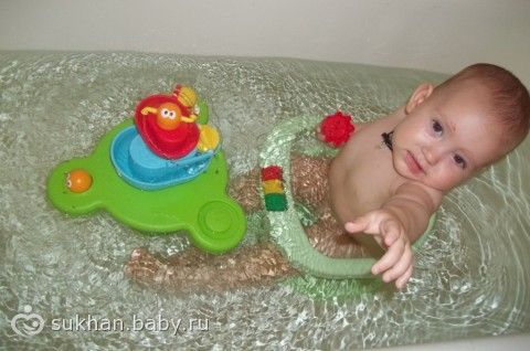 мы в ванне не сидим, принимаем душ стоя, носится по ванне, хватает что под руку попадет-шампуни, пены для бритья, губки)) а вот сын любит поплескаться в ваннне с подводной лодкой или переливать из стакана в стакан