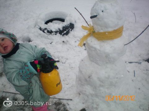снеговичек из подручных средст-глазки из саморезов, носик-непонятная штука из папиного «мусора», шарфик-пакет мария-ра, ручки-веточки, ведро на голове-только оно белое по этому не заметное!!!