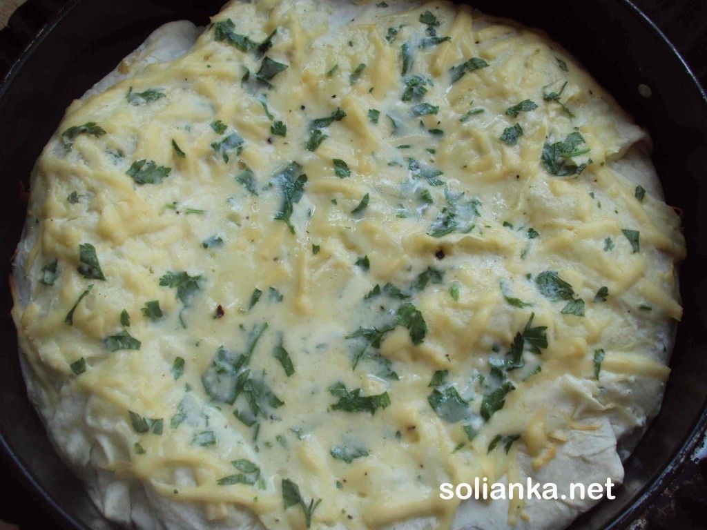Сверху присыпать тертым сыром и залить оставшейся начинкой.