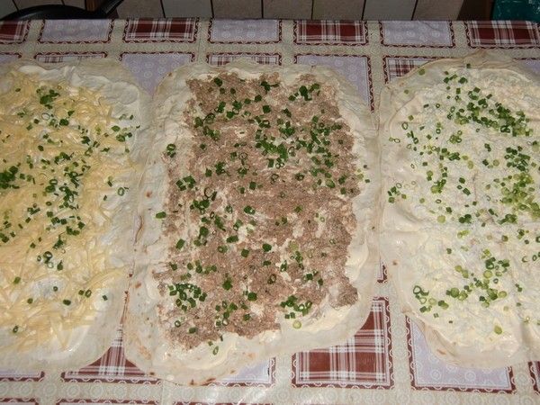 Разложить лаваш.Смазать каждый лист майонезом.На один-натереть яйца, на второй-сыр, на третий-помятую вилкой сайру.Сверху каждый лист посыпать луком и укропом.