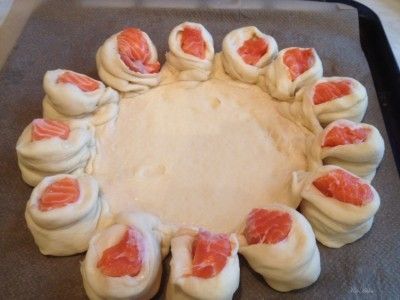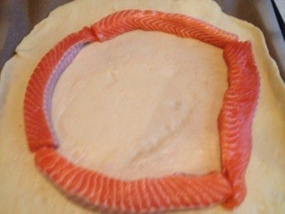 Отступить от края 3,5 см и по кругу выстелить нарезанные полоски форели. Посолить, поперчить.