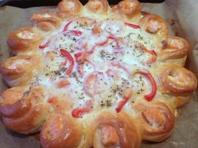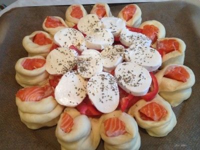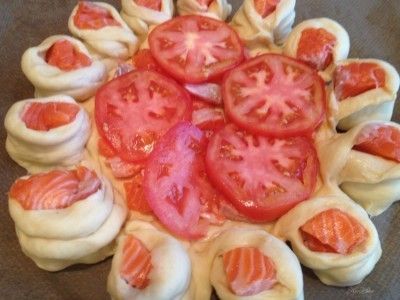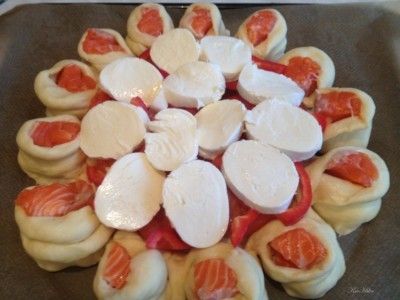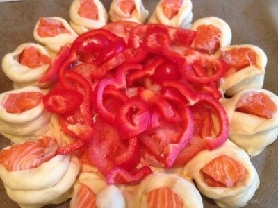 Для начинки — помидоры нарезать кружочками, перец кольцами или полукольцами, моцареллу кружочками. Форель очистить от кожицы и костей. Нарезать полосками толщиной 2,5 см.