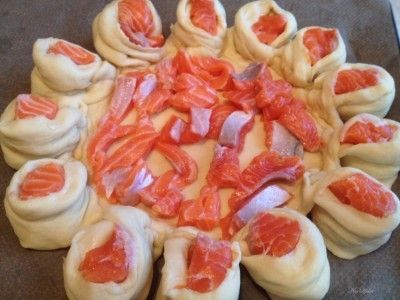 Оставшуюся рыбу нарезать кусочками и поместить в центр пирога