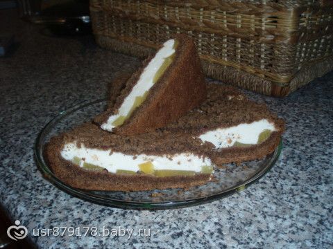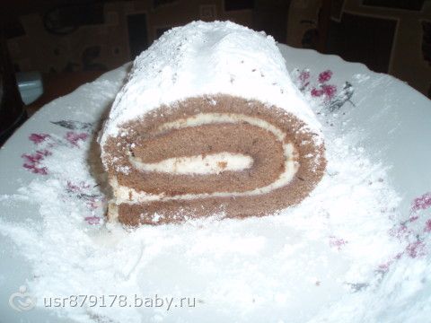 5яйц,1ст.сахара,1ч.л.разрыхлителя,4ст.л.какао,1ст.муки.Начинка: творог 300гр.растереть с 0,5 ст.сахара+фрукты любые! У меня банан и персик! Выпекать при 180гр.25мин.