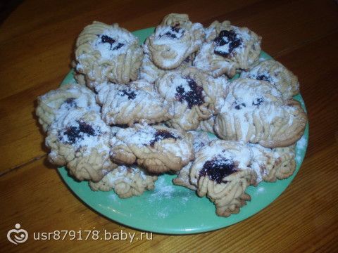пачка маргарина, 2 яйца, 1 ст. сахара, 1ч.л соды, мука 3 стакана примерно! тесто станет густым-пропускаем через мясорубку обрезаем ножом и выкладываем на противень в серединке делаем пальцем углубление и кладем варенье! я ложила ягодки черной смородины! после приготовления посыпать сахарной пудрой))))