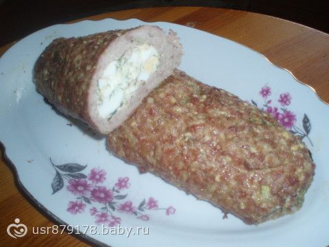 Сделать фарш, как на котлеты(у меня свинина+говядина)! Выложить на пищевую пленку! Сверху на фарш порезать отварные яйца-4шт.,300гр.сыра-на крупной терке и зелень! Скрутить в рулет, смазать сырым яйцом и выпекать при 180гр. 1час.