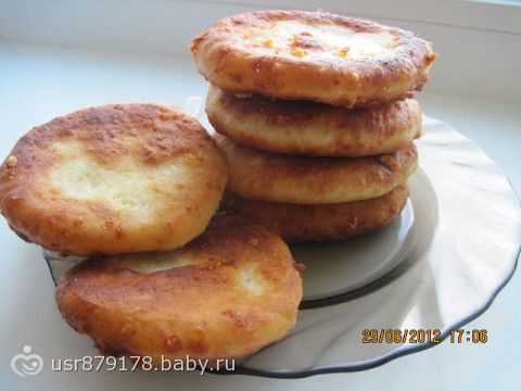 1стакан кефира,0,5ч.л.сахара,0,5ч.л.соли,0,5ч.л.соды,1стакан тертого на крупной терке сыра,2стакана муки. Смешать кефир, сахар, соль, соду. Добавить сыр, муку. Замесить тесто. Сформировать лепешки и обжарить их на растительном масле с двух сторон.
