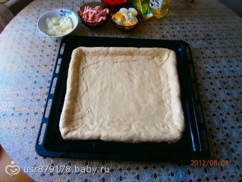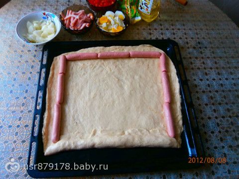 начинка может быть любая))) кто не пробывал очень вкусно делать пиццу с скумбрией в томате, соленый огурчик, крабовые палочки, помидорки и сыр)))