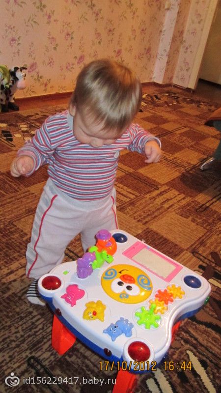 теремок Joy Toy- привлекает звуками животных, помогаю их проталкивать, злится, что не может дверку открыть на «пианине» кнопки жмет