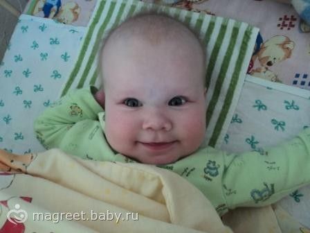 Про нее — 6600, 63 см. Вертится со спины на живот, в одну сторону с удовольствием, в другую — ооочень редко. С живота на спину не переворачивается, не сидит, не ползает — ждала, пока мама начнет дневник вести, чтоб все запечатлеть))) Любит когда пою песни, читаю стихи, купается в 30 градусной воде, много общается, знакомым улыбается, спит всю ночь и почти не плачет. Ест смесь и овощи. Очень внимательный ребенок. Самая счастливая)))