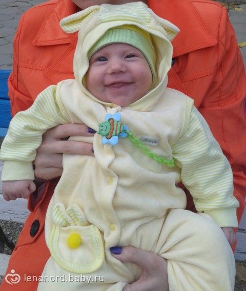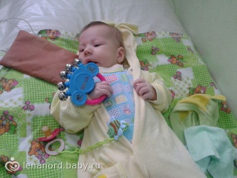 Ну и собственно, что мы умеем в наши три месяца, во всю болтаем с мамой, с зайками на постельном, с пчелками на пеленках, короче со всеми подряд