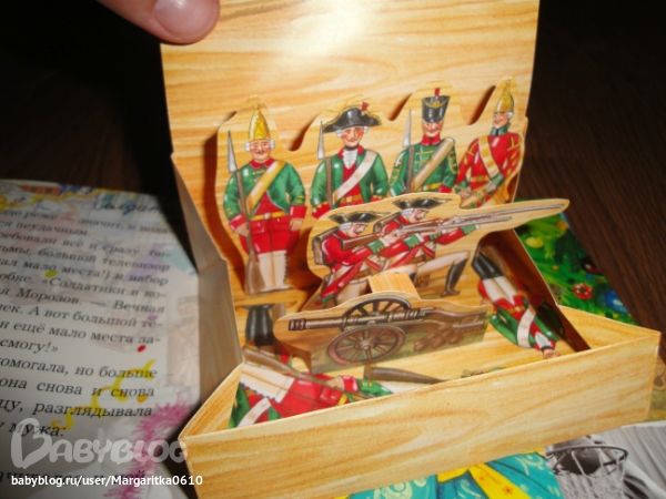 Роскошное интерактивное издание с «драгоценными камнями», серебряными снежинками и изящными бархатными виньетками на обложке украсит библиотеку самого взыскательного читателя. Почти на каждой странице ждет сюрприз — вращающийся круг-куранты, трехмерная коробка с солдатиками, книжечка-календарь, распахивающиеся резные двери — всего и не перечислишь!