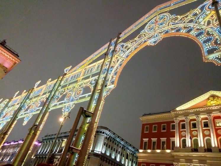 Пошли вдоль Тверской улицы, которую готовили к новогодним мероприятиям.