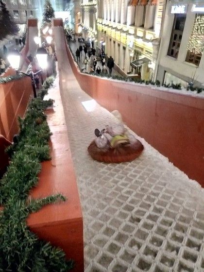 После елки в центре Гиляровского мы. естественно, увидели площадку фестиваля в Столешниковом переулке. Здесь была большая ель и детские горки, одна пониже, другая повыше. Пошли на высокую. Катались на ватрушках (покрытие не ледяное, а пластик).