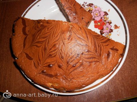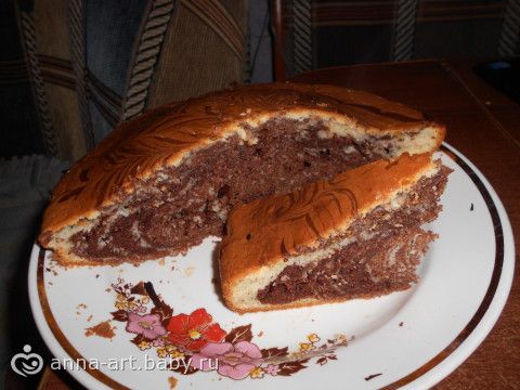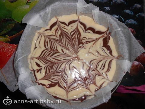 ложка темного прямо на него-ложка светлого, пятнышко на пятнышко, тесто будет растекаться и получатся кольца.Затем берём зубочистку и от центра к краям просто проводим, можно в любом напрвлении! Готовую нямку ставвим в духовку на 180 градусов и 45 минут.Приятного аппетита!!!
