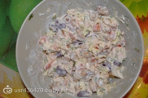1. Фасоль выложить на бумажное полотенце, обсушить. Только затем перекладывать в миску для салата.