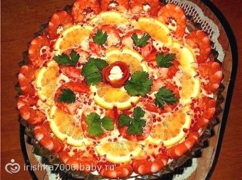Салат «Морская жемчужина» с креветками, кальмарами и красной икрой