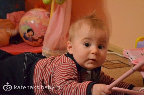 За прошедший месяц у нас прям пошел прогресс, ТТТ. Научились ползать по-правильному, я даже не заметила когда, смотрю, а он уже не по-пластунски ползает… в связи с этим, ползать по дивану ему больше не интересно и он начал активно пытаться слезть с дивана, попой вниз как рачок) мама понятное дело страхует потому что страха у ребенка нет, а у меня есть, он то не понимает что может грохнуться. Встает везде, где только можно, передвигается в доль опоры, довольно уверенно. Последние несколько дней мы освоили зал, ползаем везде, залезаем во все углы, садимся легко, ходим опершись на стены, горку, стулья, цепляемся за все что угодно и идем, ходунки используем также, а когда ставишь в них, психует и орет, не нравится ему внутри, а вот взявшись за них очень даже нравится ходить, исползали и исходили так все вдоль и поперек..)) Пару дней как научился не плюхаться на жопку, после того как постоит, а аккуратненько садиться))