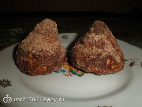 ТЕСТО-слив.масло+мука ПРИСЫПКА-какао+сахар.пудра+орехи грецкие молотые( орехи по желанию).Масло таевшеее смешать с мукой до тугой пластичной массы. главное делать это быстро чтоб масло от тепла рук не таяло. вылепить из теста конусы. можно начинить орехом или черносливом или все вместе. и выпекать. когда будут готовы вынимать по 2-3 штуки и обваливать в пудре затем в какао. вынимать по 2-3 штуки чтоб не остыли.на остывшие не приклеится присыпка.(1ст.пудры,4-5ст.л.какао это примерно) ВСЕ.ПРИЯТНОГО АППЕТИТА!