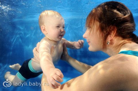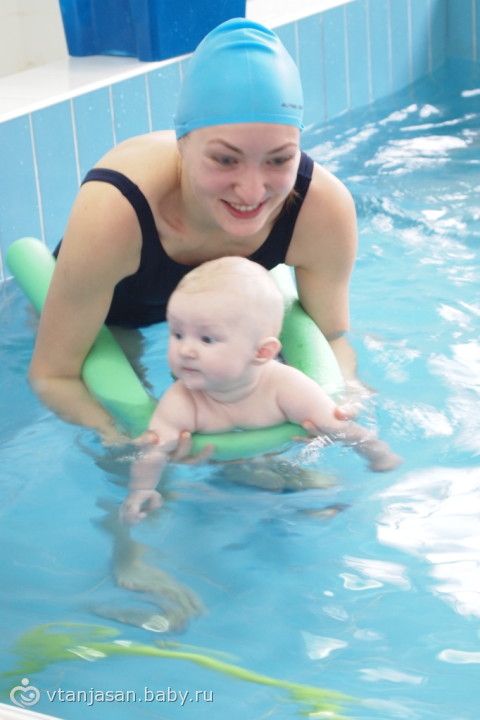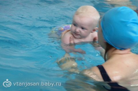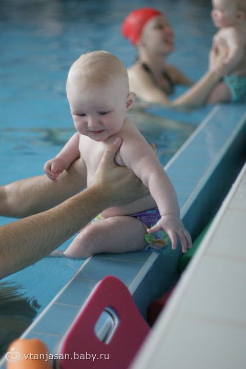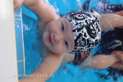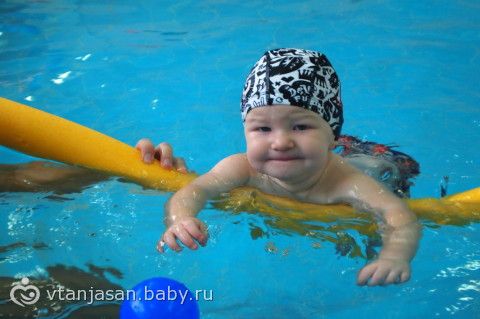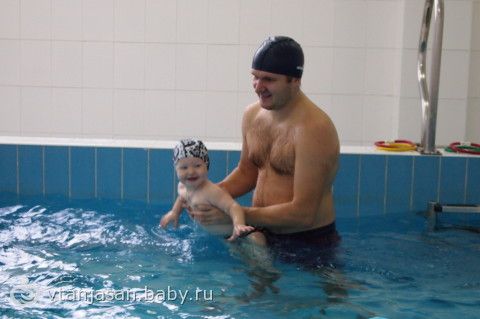 Вот уже 8 месяцев мы ходим с Митей в бассейн. С 2 недель занилась с ним в ванной, а с 4 месяцев стала ездить в бассейн. По средам с Митей плаваю — я а по субботам или воскресениям папа. Плавать мы еще не научились, но и не в этом суть… мне очень хотелось что бы ребенок с рождения не боялся воды. что бы нырял хорошо, а не как мама с заткнутым носом, хотелось повысить иммунитет ну и конечно же для физического развития))