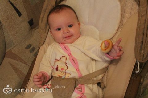 Пытаемся ползать, но пока получается только пятиться назад или вокруг своей оси. Пытаемся присесть. Когда Сашуля в хорошем расположении духа, повторяет звуки и слоги. Стала много урчать, мычать подолгу, особенно когда перед сном на тите висит, протяжно так поет себе :)