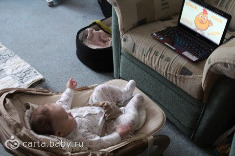 Смотрим развивающие мультики. Считалочки. Песенные короткометражки на англ. языке. И особенно нравится Tiny Love 1 часть. Доча смеется вместе с героями мульта, машет ручками и чего-то балакает :)