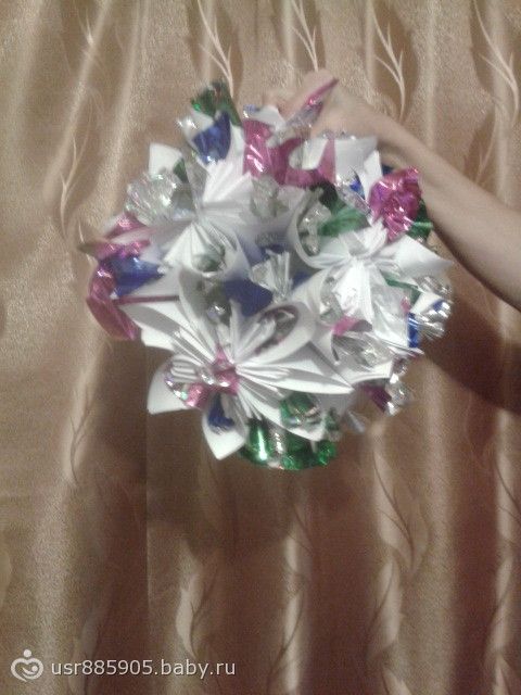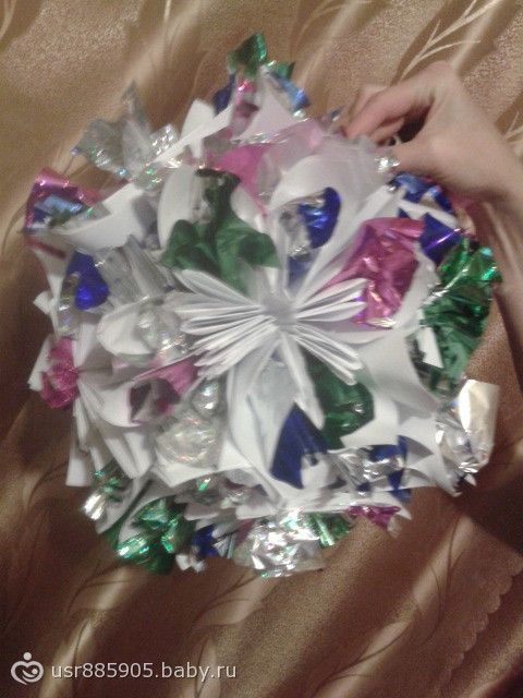 с сестренкой(1класс) сделали елочную игрушку на городсеую елку.делали 4 часа.«Цветочный шар» состоит из 96ти лепестков, каждый из который по отдельности сделан в стиле оригами.