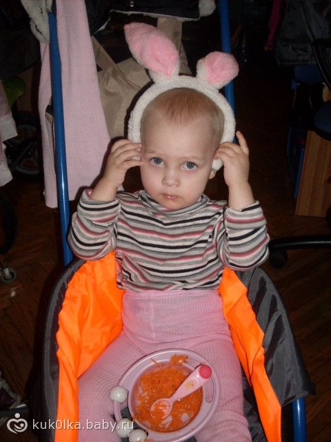 Потом доехали до площадке вытащила в покопатся в снегу взяла ее любимые формочки, но она на них посмотрела и сразу сказала «На ручки, пошли в санки» и Придя домой она не хотела из них вылезать, даже кушать в них забралась вот мой зайка кушает морковку)