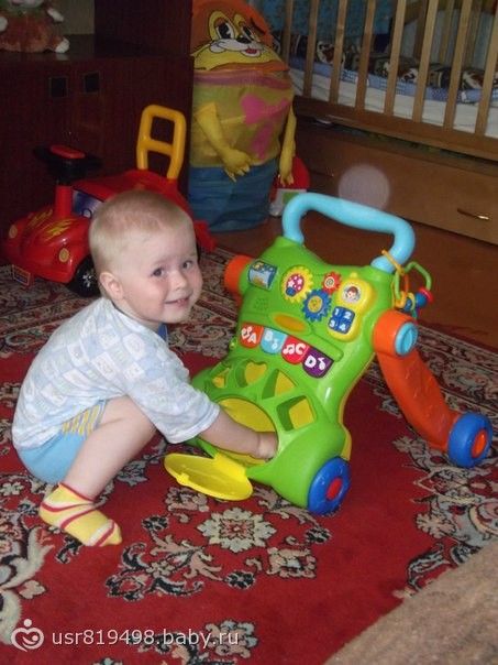 Сначала как ходунки-каталка использовали, сейчас катается как на машинке