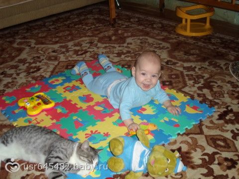 особенно удачно развивает скорость, когда видит нашу кошка!!! она просто помощница моя, всегда с ним, спит рядом-греет, когда плачет-она перед ним бегает, чтобы отвлечь и ползать он начал из-за нее-она его манила своим присутствием!!!!!