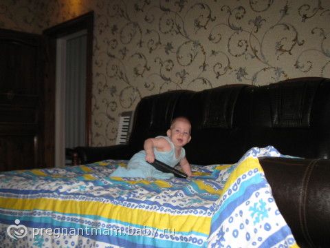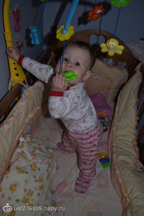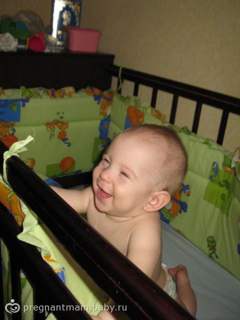 Ты че Сашуль, он у меня уже вставать пытается) когда в кроватке находится- то моська из кроватки выглядывает, на коленках сидит… а тут на днях уже пару раз пытался на ноги встать)
