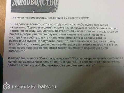 Вот посмотрите, сколько лет в союзе доказывали, что женщина сидя дома с детьми, ни на что не годна.Что её работа и не работа.Главное муж, а жена и дети так, приложение.Я когда первый раз читала, долго смеялась, представив эту картину.И заметьте изо дня в день.Без отклонений.