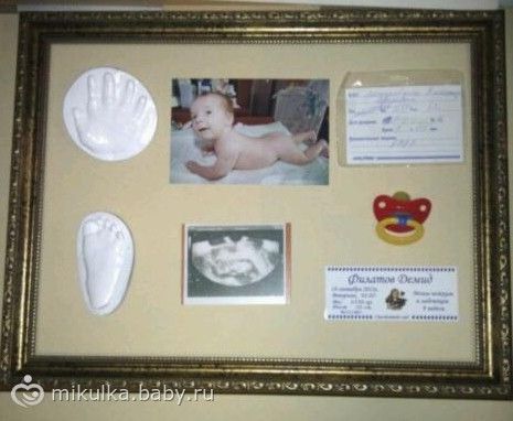 А это — макет слепочков, которые мы заказали для Дёмика. Здесь ручка, ножка, соска, первое УЗИ, где его уже хорошо видно, и бирочка из роддома))) Чтобы у сыночка был память на всю жизнь — какие крохотульки ручки и ножки были у него в 9 недель ))))