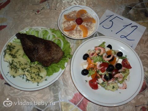 жареный антрекот из говядины с отварным картофелем, греческий салатик с креветочками и творожно-абрикосовый крем а ля дочкина радость))