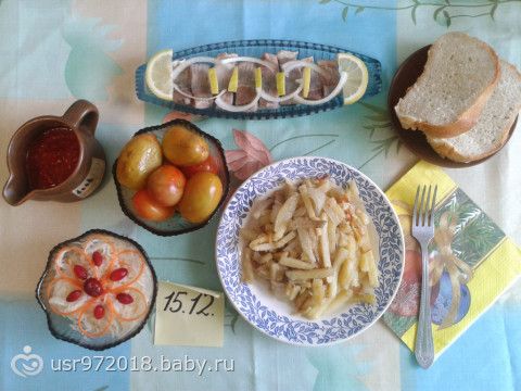 Это для любимого муженька: жареная картошка (ну любит он ее, что же я сделаю!), квашеная капуста, аджика, квашеные зеленые помидоры (все домашнее). Селедку я не ловила и не солила, только разделывала. Хлеб тоже я не пекла.